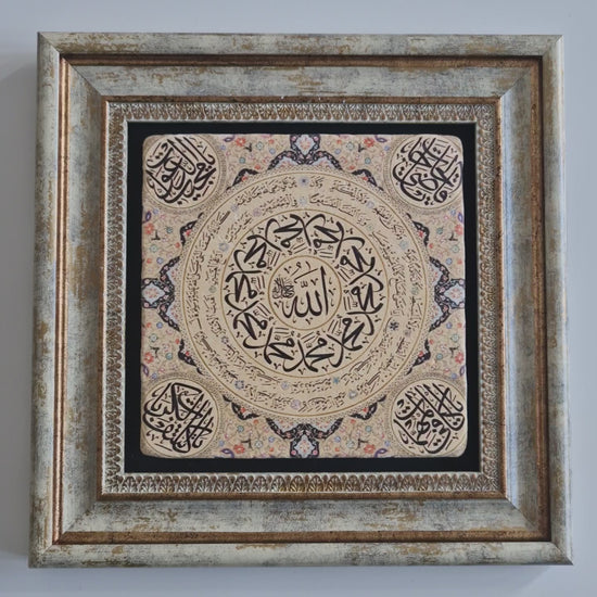 Calligraphy Description: This artwork is a Hilye-i Şerif, a traditional Islamic calligraphic piece that honours the Prophet Muhammad ﷺ through written description rather than imagery. At the centre is the name Allah, surrounded by the declaration “Muhammad is the Messenger of Allah.” The outer circle contains a classical Hilye narration attributed to Ali ibn Abi Talib, describing the Prophet’s noble appearance and character. The four corner medallions name the Four Rightly Guided Caliphs.